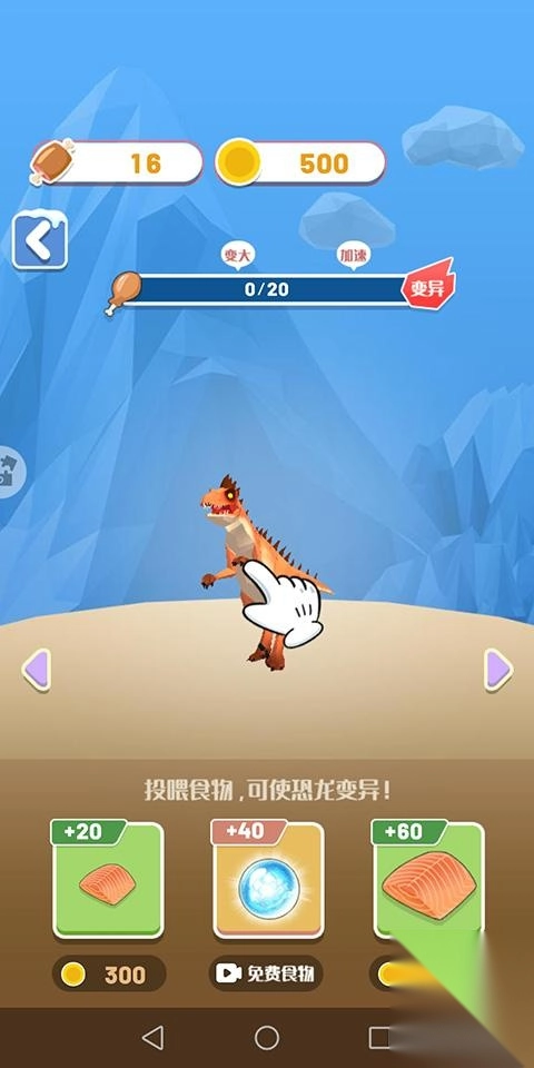 玩家在开始闯关前,能给恐龙喂食,还有机会促使恐龙变异,从而让它们获得更强大的技能。