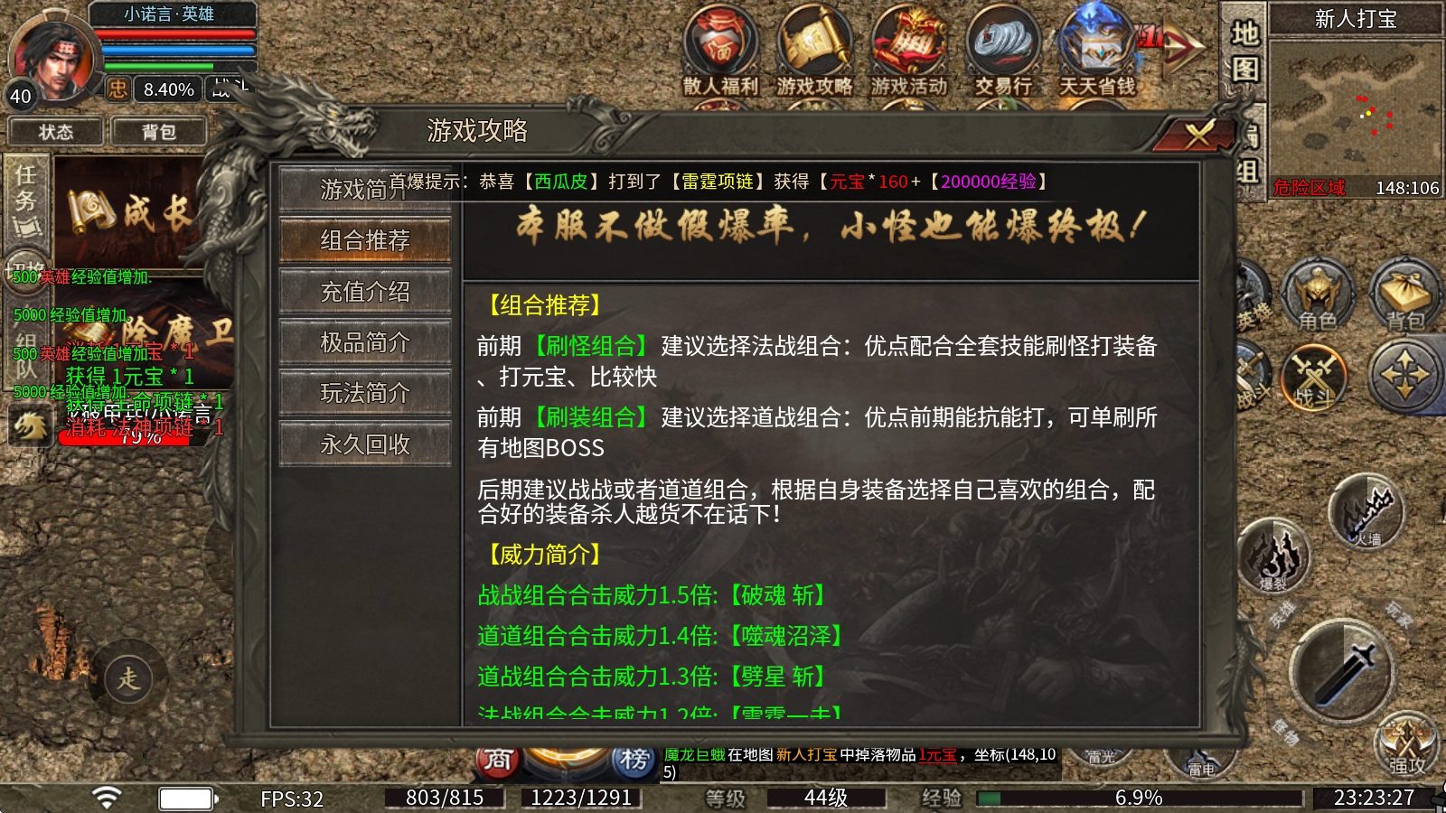 前期在【刷怪组合】的选择上,推荐采用法战组合。该组合的优势在于能够搭配全套技能进行刷怪,无论是获取装备还是积累元宝的效率都相对较高。