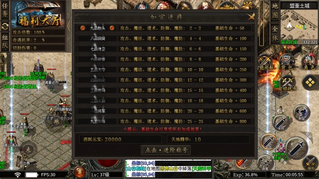 加官进爵玩法:消耗元宝与天地精华来完成进阶,每提升一级不仅能增强攻魔道属性,还可提高防御力和生命值。