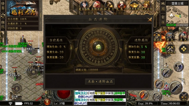 血石进阶:通过消耗元宝提升等级,每进阶一级不仅能增加生命属性,还可加快生命与蓝量的恢复速度。