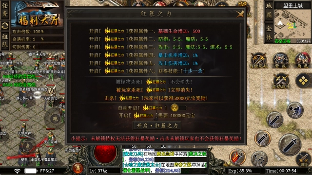 狂暴之力:激活需消耗100000元宝,解锁六大强力属性,助玩家高效开荒、快速发育!