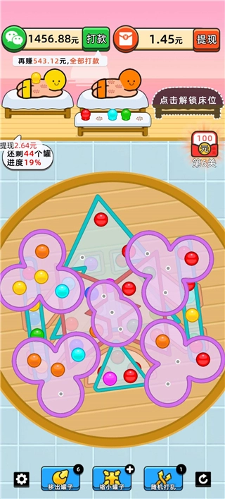 在游戏里通过点击持续消除,把相同颜色的罐子放到对应的槽位中,不过要是槽位被填满,也会造成游戏失败,这一点得留意。