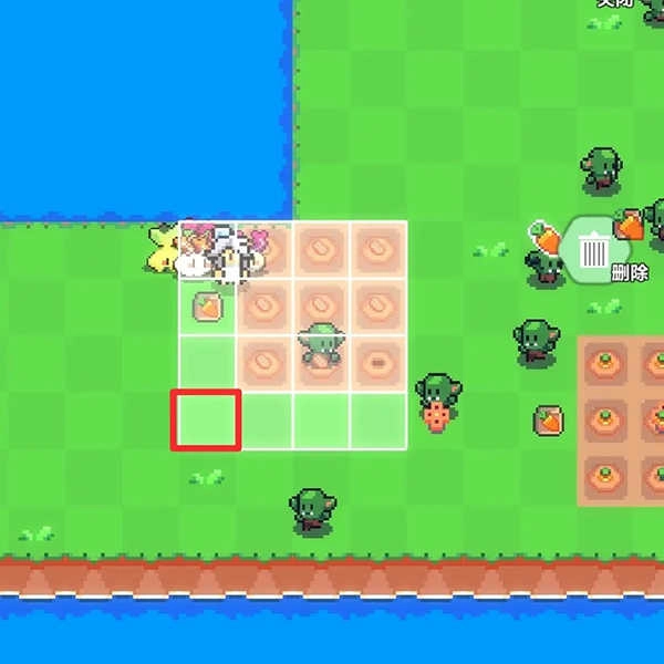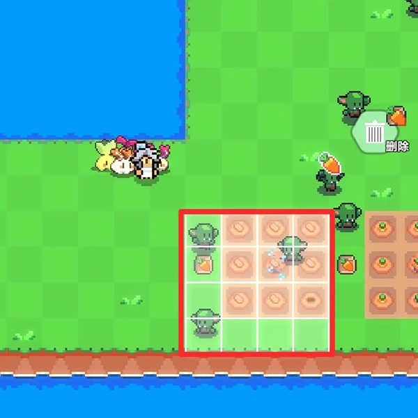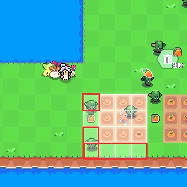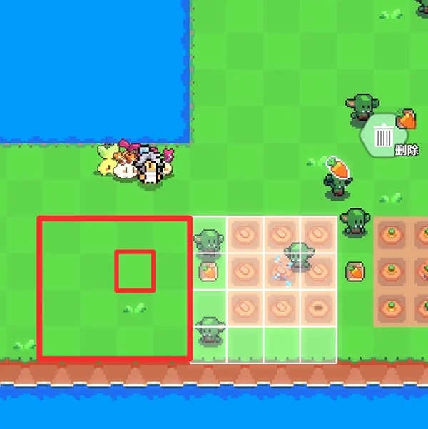 5、假定我们需把农作物移至图里的红色大方块区域,那么洒水器应当处在红色小方块区域。