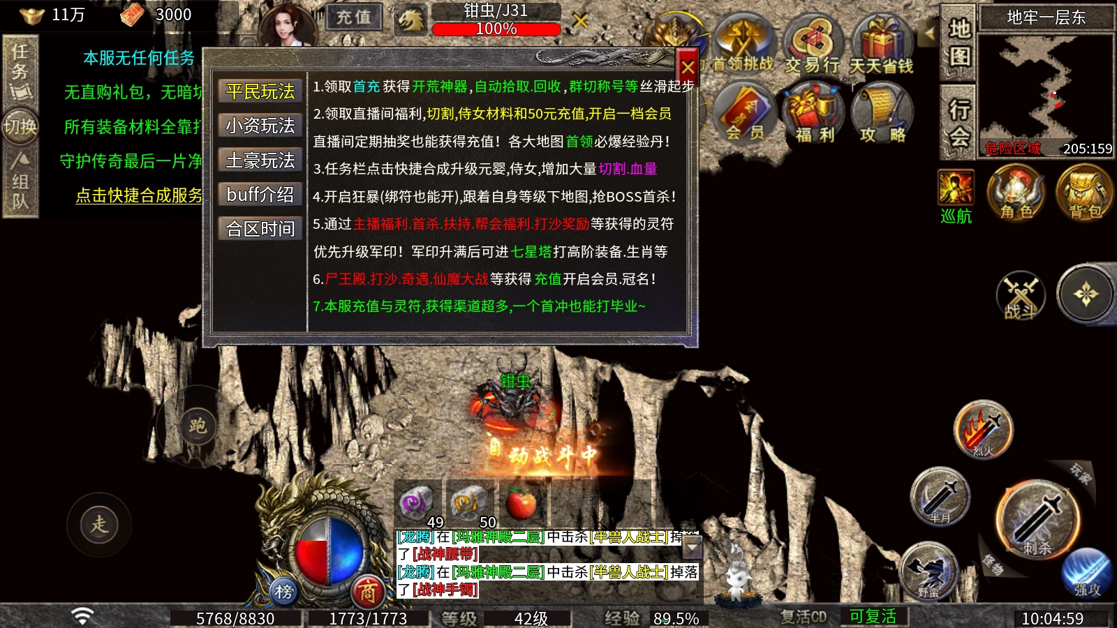 更多有趣的玩法等待你亲自去发掘,这里的机制十分新颖,游戏内的物价稳定,所有装备和材料都要通过战斗获取,游戏内容丰富耐玩,我们共同守护传奇最后的一片净土!