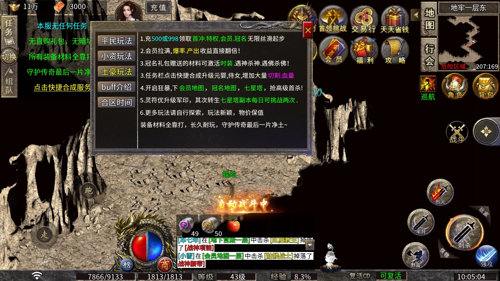 尸王殿探险、攻沙战斗、随机奇遇以及仙魔大战等玩法,可通过充值开启会员特权与专属冠名!
