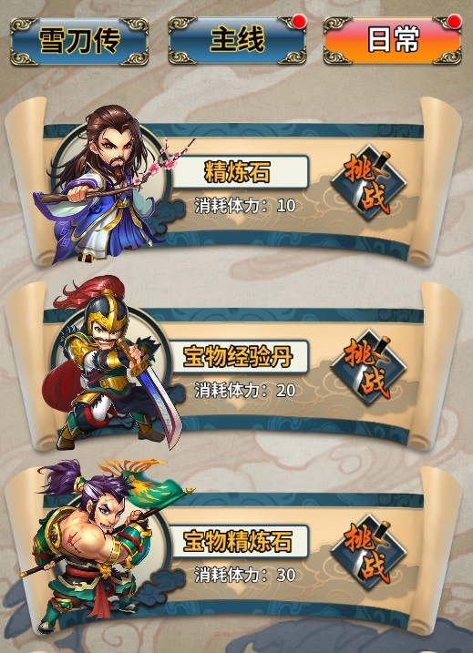 挑战日常副本能够获取丰富的资源,像银两、经验丹、精炼石、突破石、宝物精炼石、宝物经验丹都包含在内。前期日常副本的难度较低,每天都能稳定得到大量资源,所以每天上线后要记得尽早完成挑战。日常副本会依据天数开启不同的副本,当天没开的副本到第二天就会开放了。