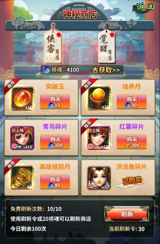 新人玩家在神将商店这块很容易忽略一个关键操作——刷新商店!这步特别重要,毕竟刷取武将很大程度上得靠神将商店。这里不仅能刷出橙将碎片,还有机会直接刷到完整的橙将。平时记得攒好将魂,要是碰到自己主力阵营的整将,一定要马上兑换拿下!别等自动刷新把它刷没了,那可就亏大了。