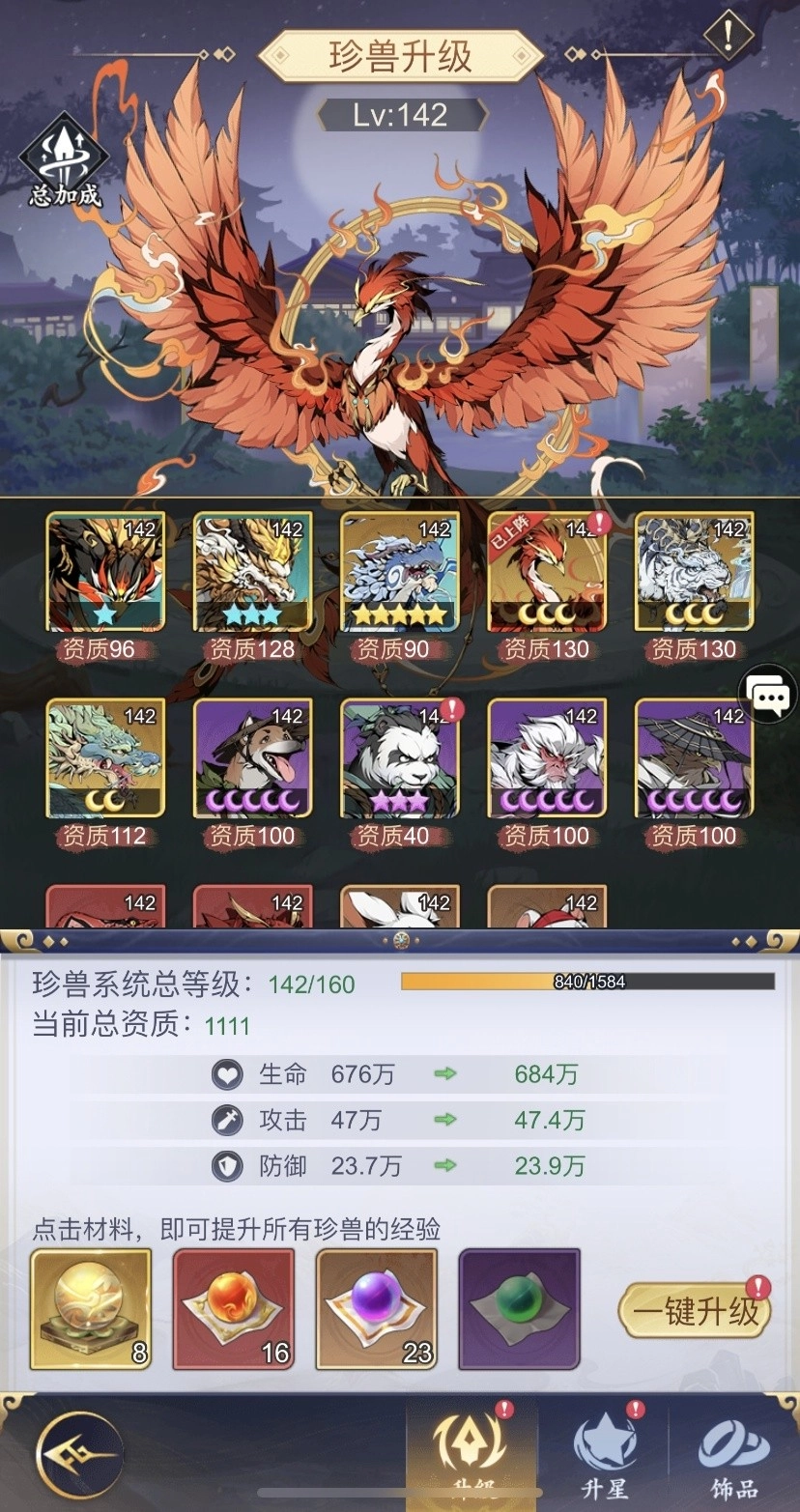 当集齐各品级对应的珍兽丹后,点击一键升级按钮,就能为所有珍兽增加经验,同时提升全军的属性。