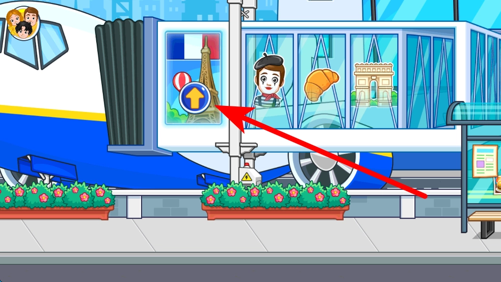 2、进入之后,在机场这类场景中能够选择目的地,例如含有埃菲尔铁塔元素的区域,点击相应箭头,即可前往不同的旅行地点。