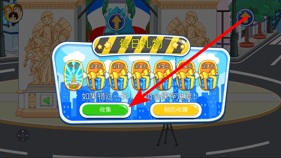1、进入场景后,你会看到每日礼物界面,点击“收集”按钮,即可领取当天礼物,同时游戏进度也会自动保存,便于你后续继续领取。