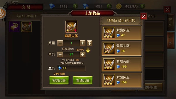 出售界面和购买界面存在显著差异。在出售界面中,您可于左侧选定拟出售的道具,并自行设定价格与出售数量。值得一提的是,当您达到特定VIP等级后,还能享有密码交易的专属权益。界面右侧会展示其他玩家出售同类道具的定价情况。建议您在同类道具供应较为充足时,适当调低自身定价,以提升被其他玩家购买的概率。
