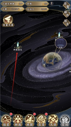 进入祖星发展模拟游戏后,点击“种族诞生”选项来推动祖星发展、提升战力,种族数量越多,祖星的战力就越高。