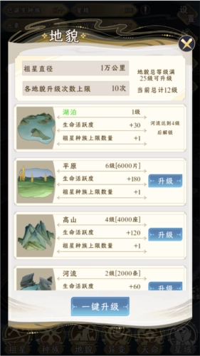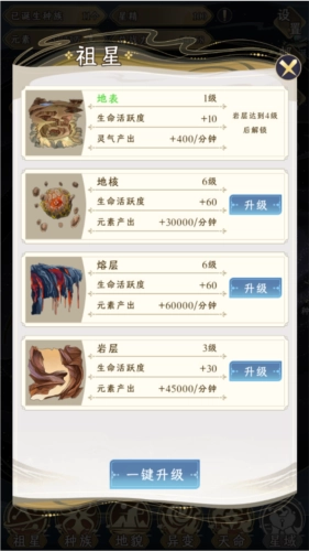 升级祖星能够提升生命活跃度与元素产出,进而孕育出更多种族。