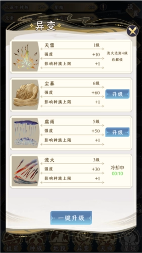 升级“异变”能够提升种族上限,异变的程度越深入,可诞生的种族种类就越丰富。