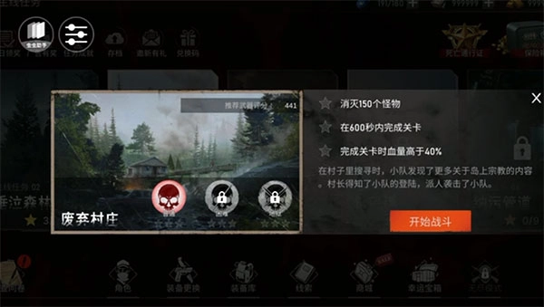 然后你可以在右侧看到这一关的任务:消灭150个怪物、在600秒内完成关卡、完成关卡时血量要高于40%,接着点击“开始战斗”按钮。