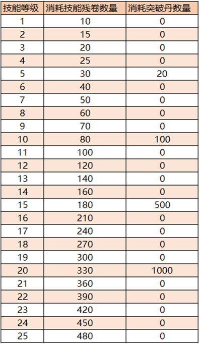 当技能等级达到5级、10级、15级、20级时,升级除了需要必备的技能残卷外,还得消耗一定数量的突破丹;而当技能等级提升至6级、11级、16级时,技能会解锁额外效果。各等级技能升级所需的具体道具可参考下图: