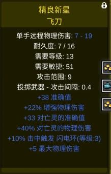 装备选择闪电套装,或者火甲搭配机械甲;饰品方面用鲜血手加亡者两件套;武器带长标枪或短标枪。这套配置的输出不如飞刀和平衡斧,虽说能用电标枪同伴自带的技能,但攻击速度慢,闪电环触发频率很低,实际使用体验差,已经被淘汰了。