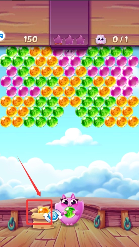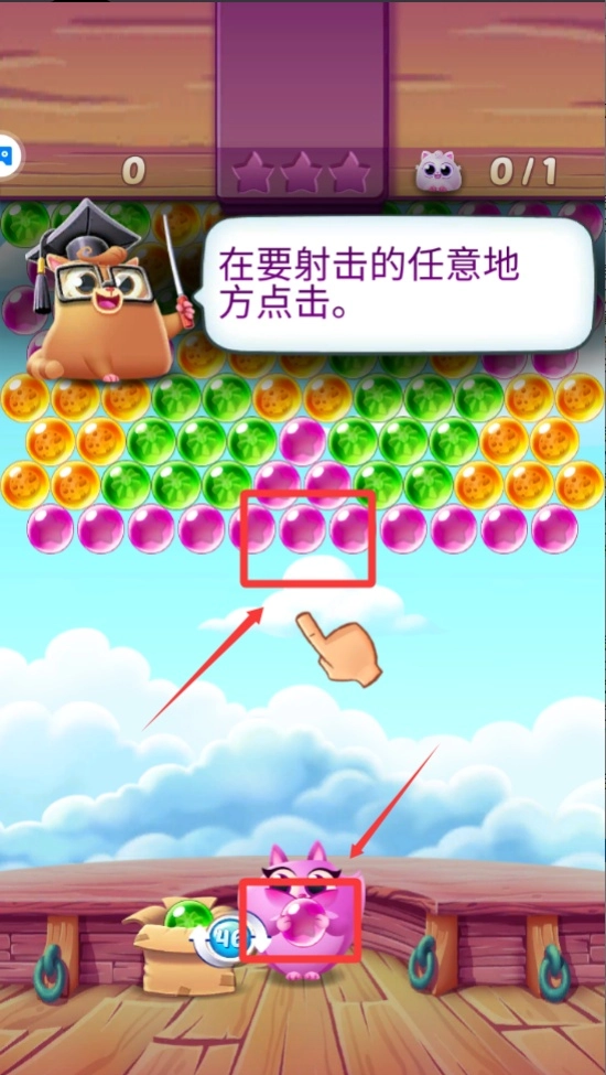 你需要操控发射器,把相同颜色的泡泡发射到对应的位置上。当三个或者三个以上相同颜色的泡泡连接在一起时,它们就会爆破并掉落下来。每成功消除一组泡泡,小猫就会往下下降一层。
