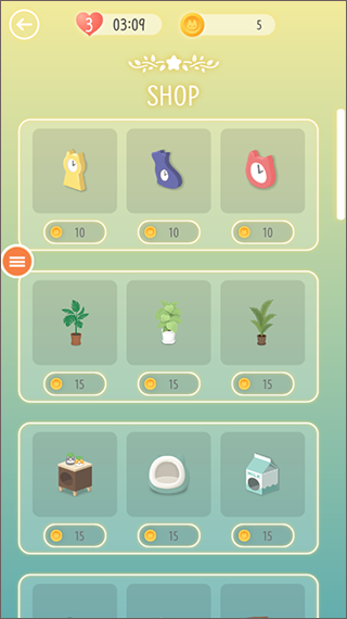 游戏通关后能得到金币,这些金币能用来购买家具,用来装点猫咪的屋子。