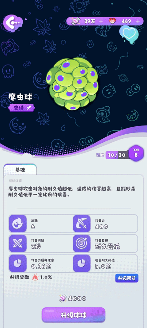 魔虫球主要用于对付小怪,哪怕是被其他球打成残血的小怪,魔虫球都能直接秒杀;而且目标病毒的血量越低,魔虫球造成的伤害就越高。