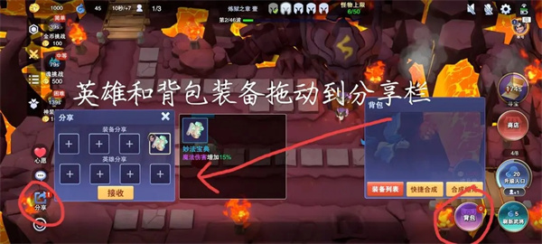 打开分享栏后,你可以把自己的英雄和装备拖到分享栏里分享给队友(队友领取是免费的),你自己也能领取队友分享的内容(同样不需要花钱)。