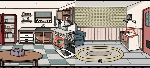 进入厨房搜寻道具,能得到烧鸡、火柴和皮皮虾;灶台下方的两个柜子里,可以找到第三只收藏要素,还有关于饼干的提示(包含饼干的图案与顺序)。