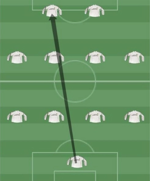 442 阵型中,右路长传的主要线路(左路长传为镜像情况,原理相同),而右路个人持球或短传配合时,会有更多左中场和右前锋的球员参与其中。