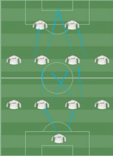 简单来说,右侧发起攻势,把球传给左侧,由左侧完成射门动作。反过来,左侧也可以这样操作。中间位置将球传给中场球员,中场可以通过倒脚后自行射门,或者把球传给前锋完成射门。