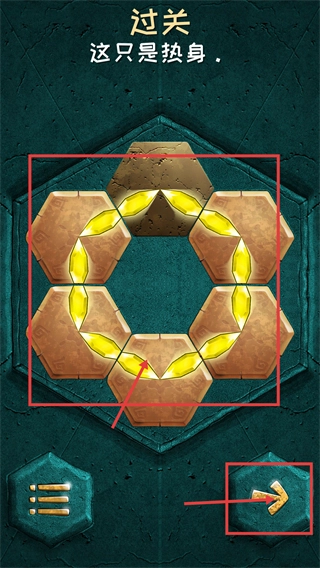 操作被红色框选的拼图块,按照箭头所指的方向进行移动,使金色纹路逐步实现连接,从而完成该区域的拼图衔接,向通关条件更进一步。