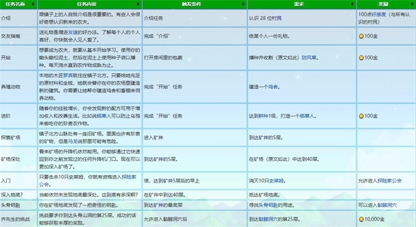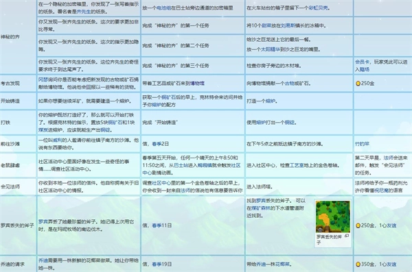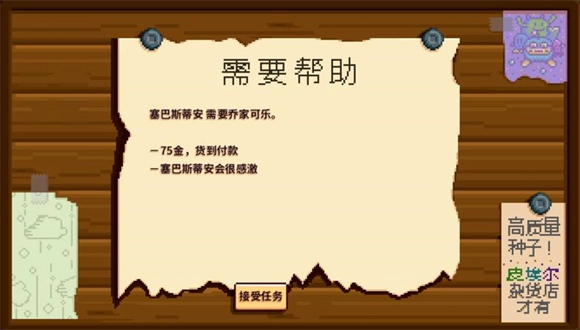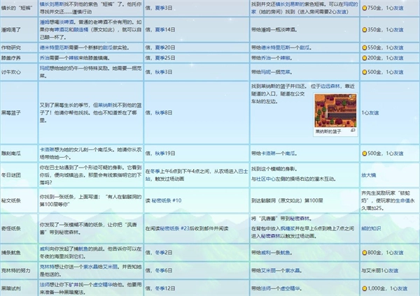 求助任务分为采集、杀怪、钓鱼、交易四类,接受后未完成也不会受到惩罚。采集任务需要玩家收集随机数量的铜矿石、铁矿石、黄金矿石、煤炭、木材或石头;杀怪任务需等矿井入口开放后才能接取,要求消灭随机数量的指定怪物;钓鱼任务会让玩家捕获1到5条当季的鱼,奖励为鱼的基础售价乘以所需鱼的数量;交易任务最为常见,可交易的物品包括当季农作物、采集品、鱼类、宝石、金属锭以及动物制品,完成这类任务时,玩家必须将物品直接送给发布任务的村民,仅把物品放在物品栏里和村民对话是不算完成任务的。