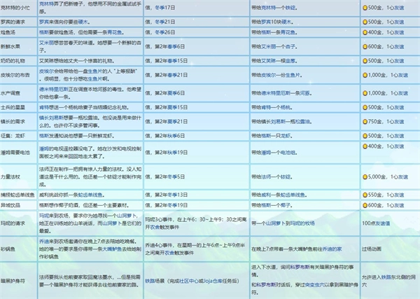 游戏推进过程中会解锁剧情任务,这类任务不存在时间限制,接取后即便在任务日志里取消也不会受到惩罚。完成剧情任务不会被计入“听差”或“帮了大忙”这两个成就。需要注意的是:任务里提到的1心友谊对应的是255点好感度,并非250点。下面是具体的任务列表。