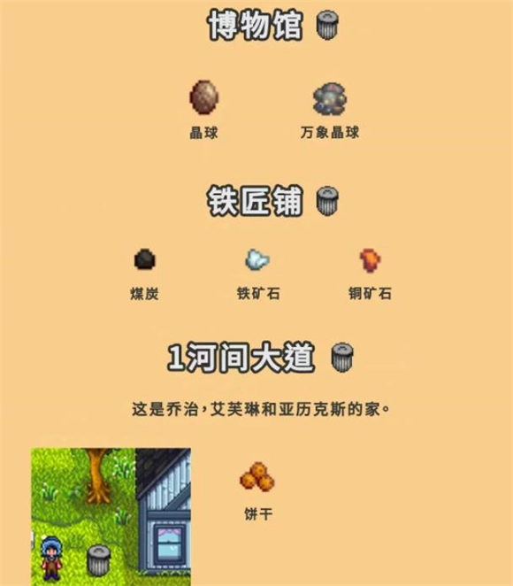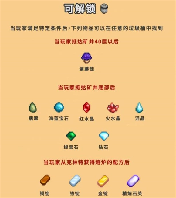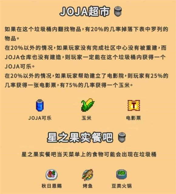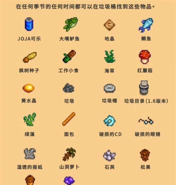 物品掉落概率会受到每日运气的影响,部分特定垃圾桶有一定几率产出特殊掉落物,该概率同样受每日运气左右。翻找垃圾桶时可能随机获得垃圾帽,需要注意的是,若翻找时附近有村民(莱纳斯除外),会被对方发现并导致好感度下降25点;而要是被莱纳斯撞见你翻垃圾桶,反而会提升5点与他的好感度。
