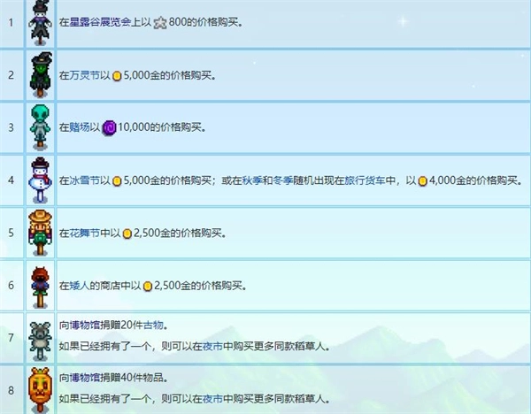 游戏里被称为珍奇乌鸦的物品,实际对应的是稀有稻草人,二者只是对同一种物品的不同叫法而已。游戏内一共有8个稀有稻草人,每个都得通过不一样的方式去解锁。当玩家把这8个稀有稻草人都收集齐之后,每晚都有90.5%的概率收到Z.C.珍奇乌鸦协会寄来的信件,信里装着豪华稻草人的制作配方,而这个豪华稻草人刚好能用来完成齐先生的任务。