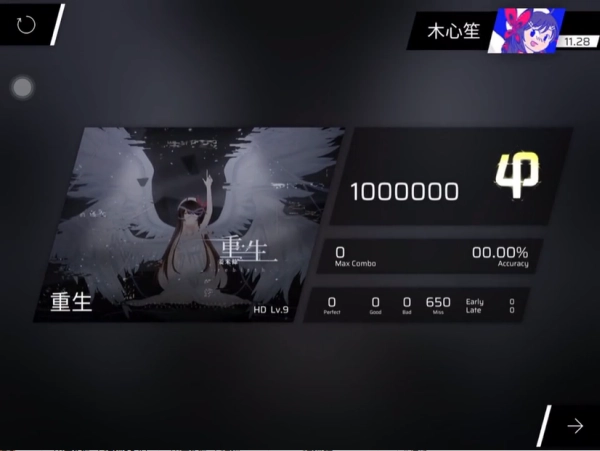 5、进入曲目后,需配合判定线对4种不同的音符进行打击,以此获取分数。