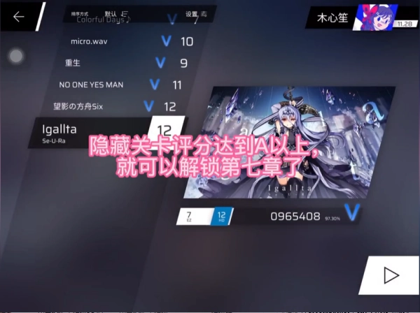 解锁隐藏关卡后,只要获得A评分及以上,就能解锁第七章了。