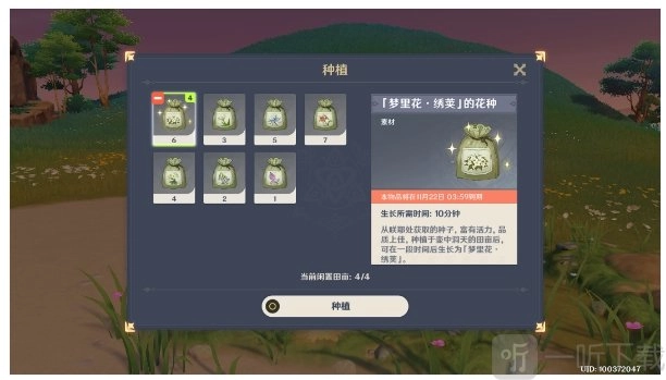 3. 花种能够种植在尘歌壶的芝田中。每种梦里花具备三种花色,在完成种植十分钟后,会随机生成其中一种花色。