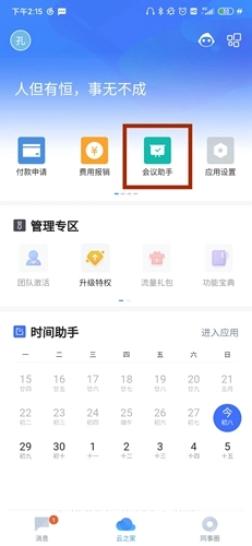 1. 打开云之家首页,在顶部功能栏中,通过滑动操作找到会议功能,然后点击该功能。