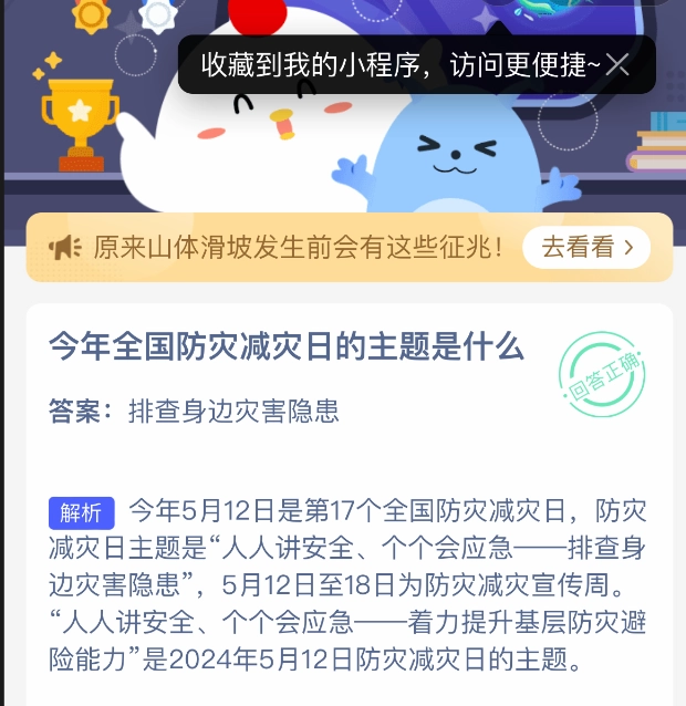 你知道今年全国防灾减灾日的主题是什么吗?这可是5月12日支付宝蚂蚁庄园小鸡答题的题目呢。支付宝小鸡答题这个活动深受大家喜爱,通过参与活动获取饲料,就能喂养小鸡,进而领取更多鸡蛋,去帮助更多有需要的人。今日这道题的正确答案是【排查身边灾害隐患】。值得一提的是,2025年5月12日是第17个全国防灾减灾日,它的主题是“人人讲安全、个个会应急——排查身边灾害隐患” 。