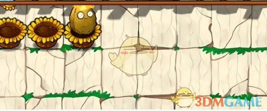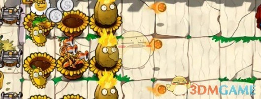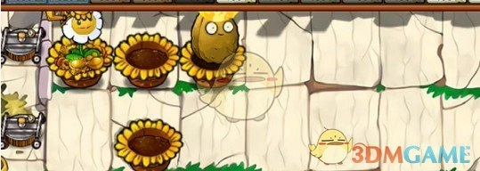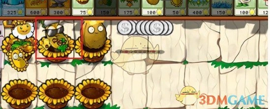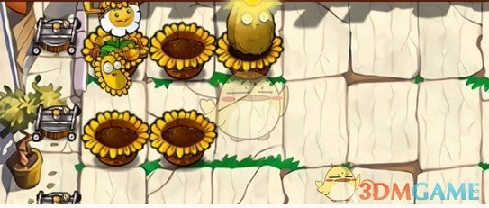 3、随后接着放置阳光花盆,且在阳光花盆的上方放置火炬坚果。