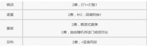 铜须:费用2点,效果为对目标造成1点伤害并对敌方英雄额外造成1点伤害。 逐星:费用2点,效果是补充2张手牌,若手牌已回满则额外抽1张牌。