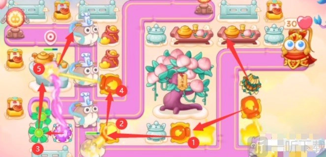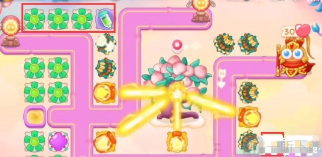 1、本关卡可使用的炮塔包括:毒针、魔法球、多重箭、风扇、火瓶。在这一关中,风扇和火瓶是较为好用的输出炮塔。