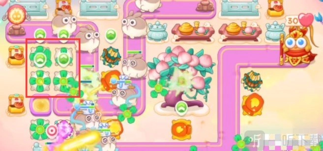 4、在左侧上方的所有格子都放置风扇,并将其升至满级。一旦有机会,就锁定桃树,趁机偷取几个。