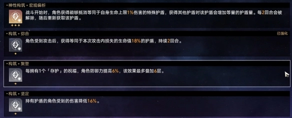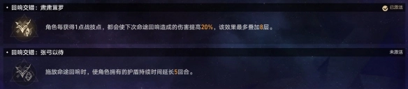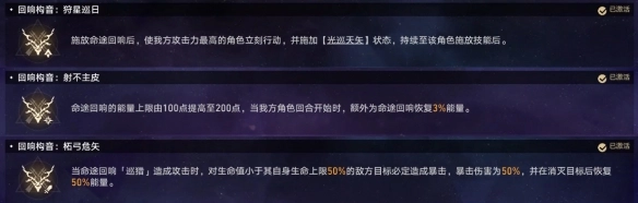 回响构音:最好拿到两个以上的回响构音。回响构音优先级为【狩星巡日】>【射不主皮】>【柘弓危矢】。