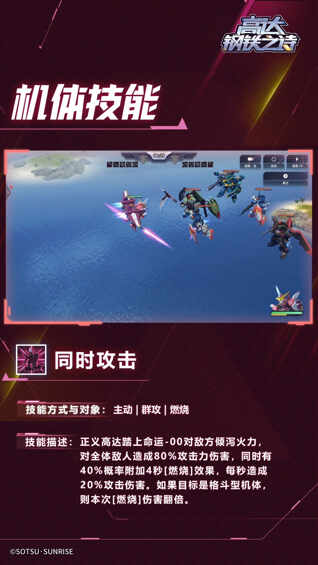 正义高达登上命运 - 00,朝着敌方疯狂倾泻火力,会对全体敌人造成相当于自身80%攻击力的伤害。并且,还有40%的几率额外附加持续4秒的[燃烧]效果,处于[燃烧]状态下,敌人每秒会受到相当于正义高达20%攻击力的伤害。要是目标属于格斗型机体,那么此次[燃烧]所造成的伤害将会翻倍。