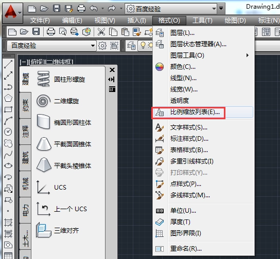 2、于CAD2014的菜单栏里选取【格式】菜单,接着在弹出的下拉列表中挑选【比例缩放列表E】选项。