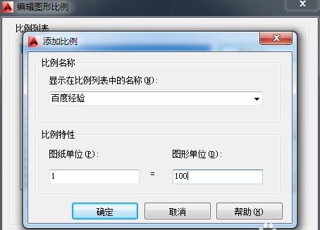 4、倘若列表里不存在你能使用的比例,那么可点击【添加】按钮,在【添加比例】对话框的“显示在比例列表中的名称”文本框内输入所需的比例值,设定好【图形单位】与【图纸单位】的比例后,单击【确定】按钮。