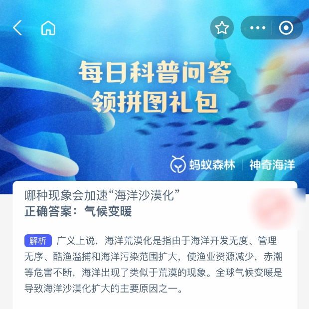 2025年6月26日,支付宝蚂蚁森林神奇海洋的问题已更新。今日题目为:哪种现象会加速“海洋沙漠化”?正确答案是:【气候变暖】。全球气候变暖是致使海洋沙漠化范围扩大的主要因素之一。