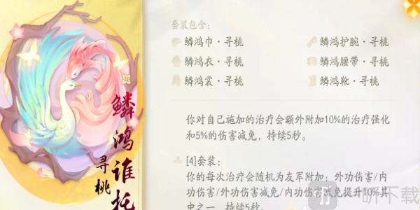 2、四件套效果:在治疗队友时,会额外获取一个随机效果,该效果从以下几种中随机产生:外功伤害提升、内功伤害提升、外功伤害减免、内功伤害减免。