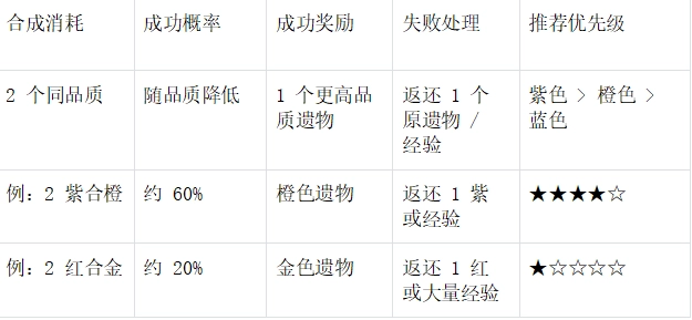 1. 合成误区:避免用橙色遗物硬合红色(成功率低于 30%,建议攒鎏金币抽卡)。