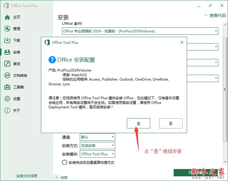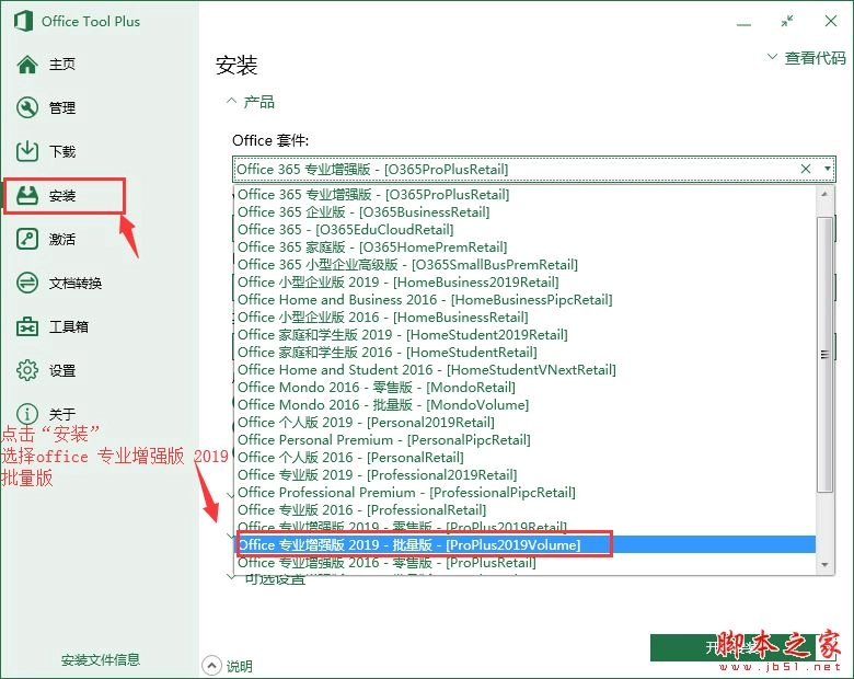 2、在左侧点击安装---于Office套件中选择:Office 专业增强版 2019 - 批量版 - [ProPlus2019Volume]
